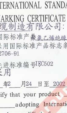 國家技術(shù)監(jiān)督局采用國際標(biāo)準(zhǔn)證書(聚氯乙烯絕緣和護(hù)套電力電纜)