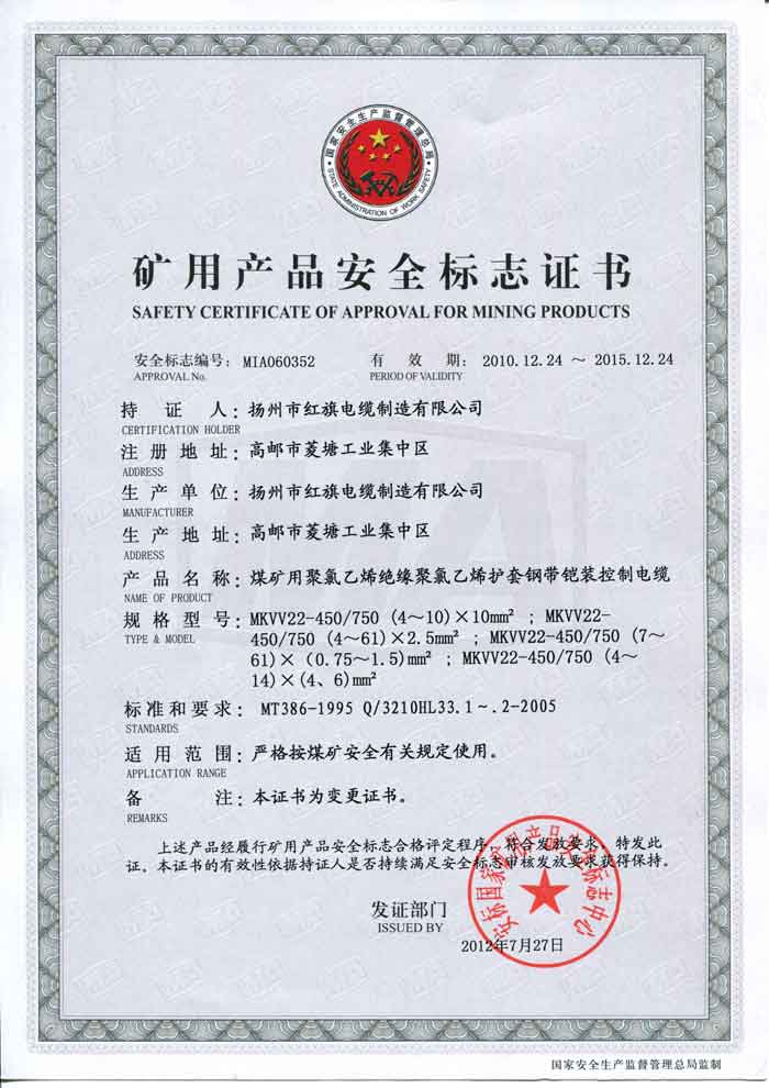 煤礦礦用產(chǎn)品安全標(biāo)志證書-MKVV22