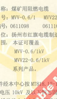 國(guó)家采煤機(jī)械質(zhì)量監(jiān)督檢驗(yàn)中心檢驗(yàn)合格證--煤礦用阻燃電纜(MVV-0.6/1 MVV22-0.6/1)